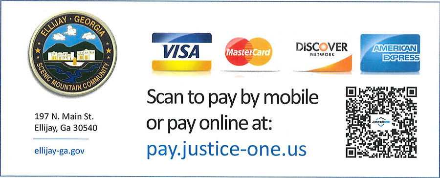 Welcome to the online Traffic Ticket payment page for Ellijay, GA, where Visa, MasterCard, Discover and American Express are accepted. Note there is a service fee charged by a third-party company, Government Window, to cover the cost of this convenient and secure payment service.
